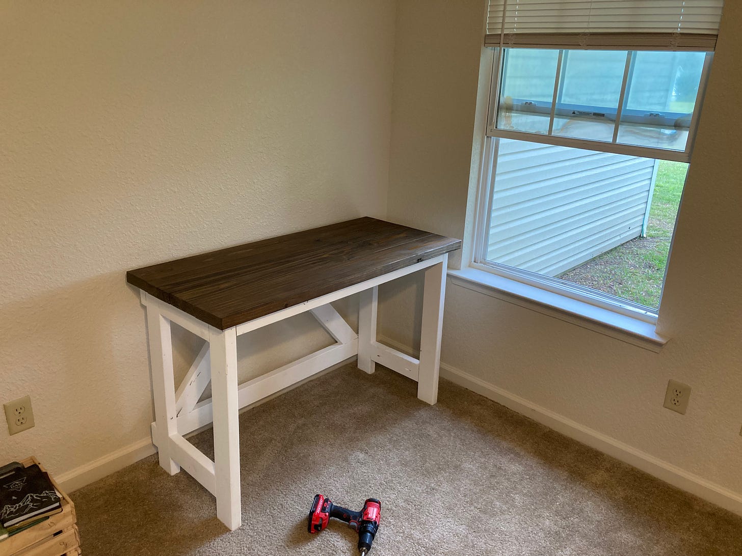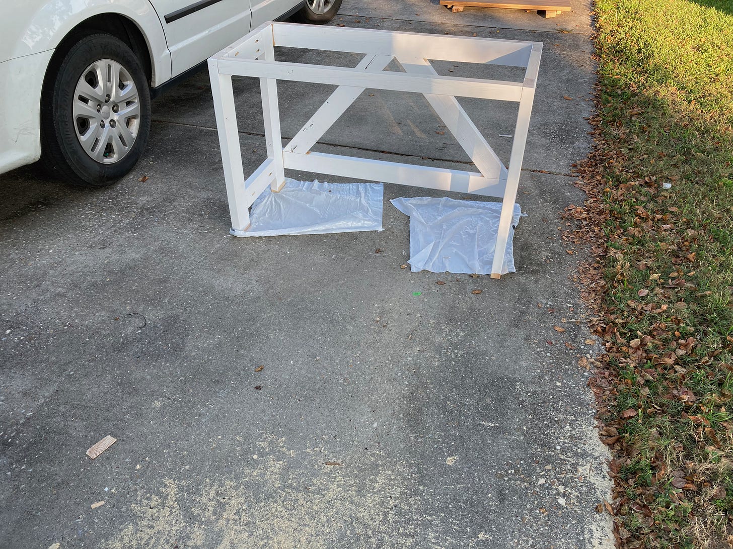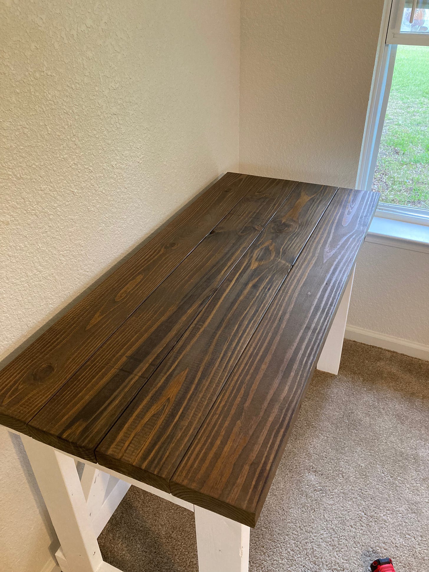 I don’t know if this step really needs explanation. I use a sponge to apply stain so I don’t use too much and I used a 3in roller for the white paint. I didn’t stain the bottom of the desktop. I set some trash bags on the driveway to avoid leaving marks on a rented property.