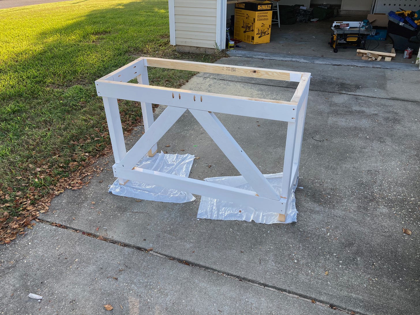 To go back and write this in a series of steps suggests thats I had a project plan when I started. I assure you, no such plan existed. I knew that I would assemble the frame and top separately so I could apply the stain to the top and the paint to the bottom before I connected them. I would measure out the materials as I went ensuring that everything was the right size (the right size meant using the wood I had and not having to go back to Lowe’s). But, for the purpose of organization I’ll outline the process in steps here so it is easier to follow.